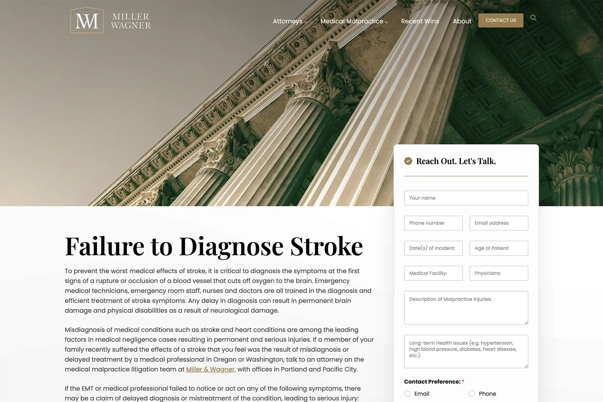 For decades, Miller & Wagner LLP has focused exclusively on medical malpractice law, representing clients across Oregon and Western Washington in catastrophic injury and wrongful death cases. By intentionally limiting the number of cases they accept, the firm provides each client with the individualized attention and trusted advocacy they deserve. With extensive experience in birth injuries, brain and spinal cord trauma, surgical errors, and misdiagnosis, Miller & Wagner is recognized as one of the region’s most experienced medical malpractice law firms. Clients turn to the firm for clear guidance, compassionate support, and proven results. Contact Miller & Wagner today for a free, confidential case evaluation.