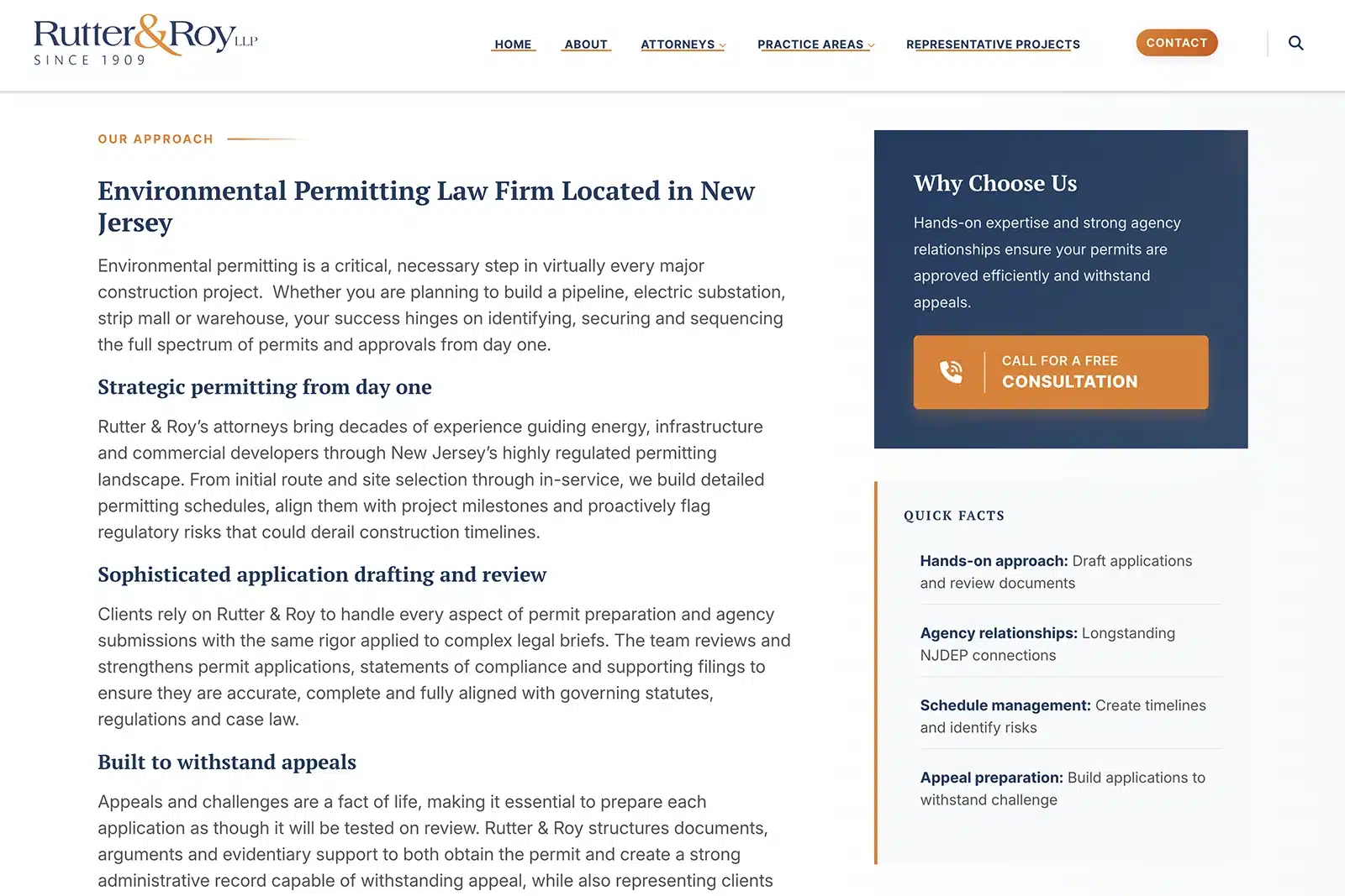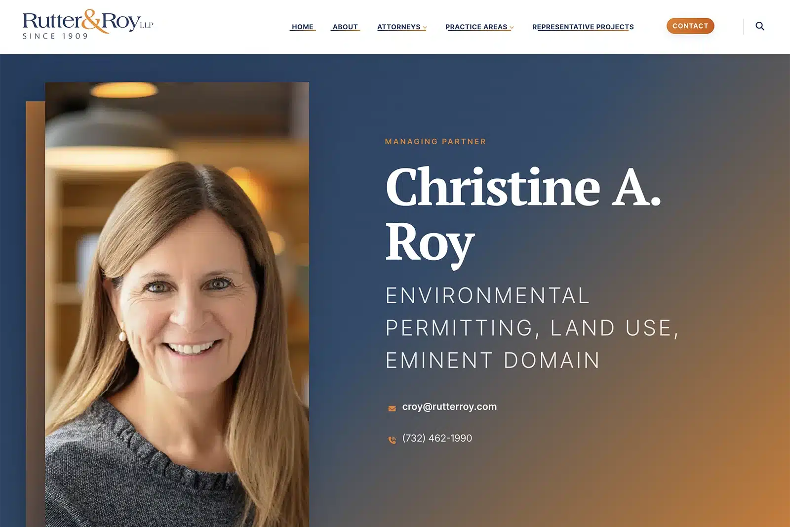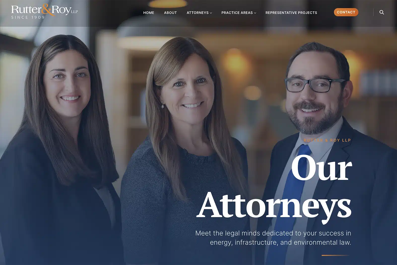 Rutter & Roy LLP has practiced energy, infrastructure, and environmental law in New Jersey since 1909, serving Fortune 500 companies and regional utilities across all 21 counties. Their digital presence didn’t reflect it. The goal: build a site that earns immediate credibility while communicating what makes them genuinely different from the big firms they compete with.